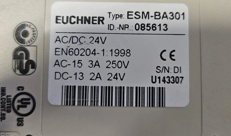 Il modulo ESM-BA301 è un relè di sicurezza EUCHNER a 24V AC/DC progettato per applicazioni industriali che richiedono un controllo affidabile delle funzioni di sicurezza. Questo modello usato è stato testato e verificato per garantirne il corretto funzionamento.